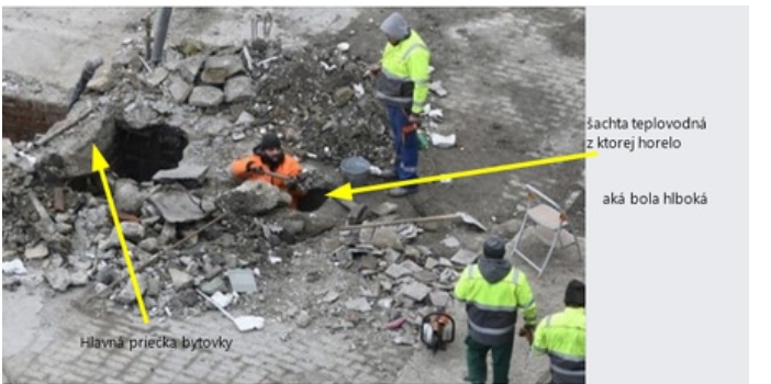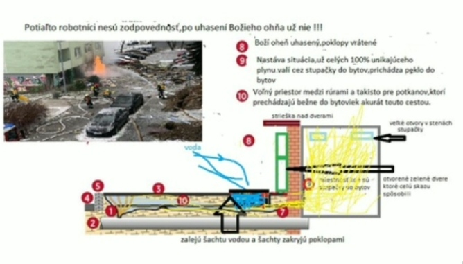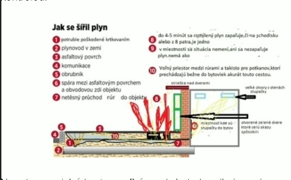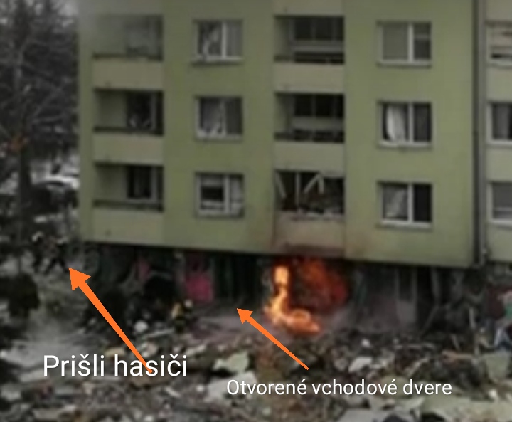 XXX : Neni pravda.Pretože požiarnici,hneď po zásahu,mali rozhovor do TV a vchodové dvere nikto,nikde,nikdy ani len nespomenul,že napríklad: ,,po príchode sme museli rozbiť vchodové dvere a zistili sme ,že schodisko je zasypané",alebo,že ,,niekto im otvoril vchodové dvere,aby sa dostali na schodisko",čo je blbosť a po výbuchu,určite pani nebežal ku tým dverám,aby išla pozrieť,čo je na schodisku jej manžel,veď ona volala s manželom okamžite,ako to potvrdila do kamier.V skratke,dvere niekto otvoril dokorán cca 4-5 minúty pred výbuchom,buď aby sa vetralo,ako vetrá správca,to je najpravdepodobnejšie,lebo kázali vetrať všetkým v bytovke,tak určite chceli vetrať aj schodisko,ale kto tie dvere otvoril,to už nikto nezistí a nikto nepovie pravdu,radšej budú tvrdiť všetci,že dvere pred výbuchom boli zavreté,čo je nereálne,lebo tu sú ďalšie mega dôkazy,že dvere sa otvorili dokorán presne cca 4-5 minút pred výbuchom.Pozrite si teraz fotku,oko sú umiestnené dvere na baráku a kde sú šachty,ktoré robotníci otvorili.Cez tie šachty,keď odstránili tie poklopy,unikalo pred výbuchom celých 100 % plynu,z poškodeného plynového potrubia,pred barákom do ovzdušia a celej ulice.Všimnite si aj,kde sú umiestnené plynový uzáver a hlavný istič bytovky,to je tiež dôležité.Táto fotka je urobená z Google maps.