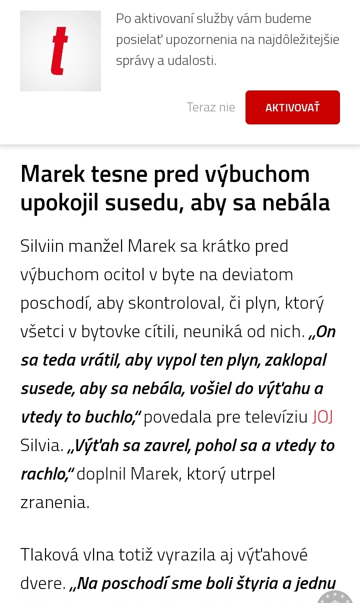 XXX : Presne tak.Ak by sa plyn dostával cez tie stupačky,alebo nejako inak na horné podlažia,to by bol výbuch už dávno predtým,lebo ľudia neustále používali výťah alebo ľudia ,ak by mali fakt plyn v bytoch,tak by utekali z bytovky všetci,čiže aj pán z 8 patra,alebo alebo tá pani suseda na 9 patre,alebo pani s dieťatkom,čo vypovedala v RTVS dokumente,alebo sused na 11 patre, ktorý nevolal plynárom tiež,lebo plyn nemal v byte,ale bol vonku,lebo ak mali ľudia plyn v bytoch a nevolali záchranné zložky,tak tiež nesú zodpovednosť potom rovnako,ako robotníci.Ten plyn fakt prišiel na chodbu nie skôr,ako 4-5 minút pred výbuchom a ako ďalší mega dôkaz,je výpoveď pána,z 8 patra,ktorý býva s dcérou v byte.Ten jasne potvrdil do kamier,že plyn sa začal valiť cez chodbu,po schodišti nahor,preto bežal na balkón a kričal z balkóna na ľudí pred barákom,aby okamžite zastavili plyn a že po chvíli nastal výbuch.Čiže aj toto jasne dokazuje,podľa času,že táto situácia sa odohrala cca 4-5 minút pred výbuchom,čiže plyn bytovka nasávala 1 minútu,to zacítil tento pán,ostáva 3 minúty do výbuchu,nato bežal na balkón kričať,čiže dalšia minúta dole,do výbuchu ostáva 2 minúty a ako potvrdil,,no a po chvíli to buchlo" ,čiže presne aj tento čas potvrdzuje,kedy asi si bytovka začala nasávať plyn,čiže plyn bytovka skôr,ako 4-5 minút pred výbuchom nemohla nasávať,ani nijako inak sa tam dostať,ako cez otvorené vchodové zelené dvere.Tu je výpoveď tohoto pána.
