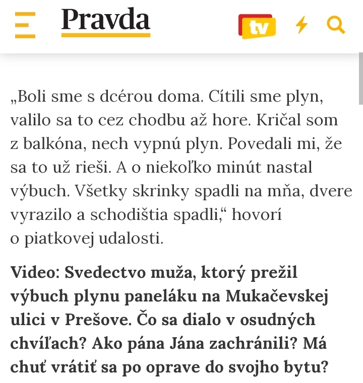 A ešte jeden mega dôkaz,kedy,RTVS urobila dokument o výbuchu v Prešove a tu pani s dieťatkom jasne potvrdila tiež,že plyn sa valil cez chodbu,nemala plyn v byte,ale bol na chodbe,tu je jej výpoveď,kde hneď v úvode videa pani povie,že plyn bolo cítiť pred bytami na chodbe.A toto povedala pár mesiacov po nešťastí.Veľmi pekne Ďakujem tejto pani,aj RTVS za tento dokument,lebo toto je mimoriadne dôležitý dôkaz.