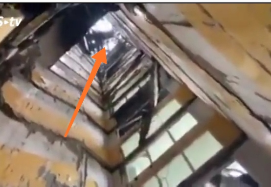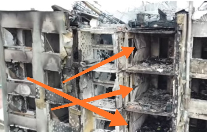 A tu sa dostávame do finále.Ako tento pán vošiel do bytovky a buď on,alebo niekto presne v tom čase otvoril tie vchodové dvere dokorán,aby sa napríklad vetralo aj schodisko,tak ako vetral správca kotolňu a ľudia byty,plyn sa začína tlačiť na schodisko.Totižto schodisko,kedže je hneď pri dverách,začal plyn stúpať hore,nešiel ku výťahu,ani nemohol,lebo je ľahší,ako vzduch,tak stúpa hore,tiež aj za pomoci komínového efektu a pán ho nemohol ani trošku zacítiť,keď nastupoval do výťahu,lebo výťah bol asi až v strede bytovky,nie hneď pri schodisku.Preto,keď pán nastúpil do výťahu a stlačil 9 patro,nič sa zatiaľ nestalo,pre lepšie pochopenie,ako on stúpal výťahom hore,tak zároveň stúpal aj plyn po schodisku hore.Pán zastal na výťahu na 9 patre ,išiel do bytu,kde sa zdržal cca 3 minúty.Čiže keď spočítame čas 3 minúty v byte ,plus 1 minútu kým sa dostal na 9 patro výťahom,tak bytovka si nasávala komínovým efektom,z vonku plyn,cez otvorené vchodové dvere cca 4 minúty,iná cesta nebola,ako sa tam plyn mohol dostať,ak by bola iná cesta,to by nastal výbuch oveľa skôr,pri používaní výťahov.Čiže,za tie 4 minúty sa pod plafon 12 poschodia schodiska nahromadil plyn,koľko?to by museli vypočítať experti,podľa plameňa ktorý horel pred barakom,ďalej ľahšiemu nasávaniu plynu do bytovky na schodisko pomohla aj tá strieška,ktorá prechádza ponad dvere,pod ktorou stál aj správca.Podľa plameňa ktorý bol už po výbuchu iba 70% tný na odvetrávanie zo šachiet pred barakom,lebonpo výbuchu si komínovým efektom ťahali stupačky cca 30 percent plynu,mohlo unikať tak 0,5 - 1 m3 plynu za sekundu a z tejto časti si cez otvorené vchodové dvere mohla bytovka na schodisko potiahnúť napr. 10% ,čiže za tie 4 minúty si mohla bytovka na schodisko potiahnúť pohodlne aj 10,aj 20 m3 plynu,len ako sme vysvetlili vyššie,keď plyn vybuchne,zväčší objem do 3 sekúnd aj 1000 x a to je to zlé,čiže ak si bytovka potiahla za spomínané 4 minúty napríklad 15 m3 plynu,tak keď plyn vybuchol,zmenil sa na 15 000 m3 a to naviac za iba 1-3 sekundy,čiže tlak sa oprel o plafon,o schodisko,ktoré jednoducho stlačilo smerom nadol,ako domček z karát,odthrlo aj plafón,to je tiež dôkaz,že to tam buchlo a vytrhalo panely na dedkovej strane,čo potvrdzuje,že výbuch nenastal v žiadnej výťahovej šachte,ako sa tvrdilo v médiách, že vytrhlo výťahové dvere a pán z 9 patra vyšiel von.To je hlúposť,ak by nastal výbuch vo výťahovej šachte,tak tie výťahy by ten tlak vystrelil,ako keď z pištole vyletí guľka.Totižto,tie výťahové dvere,nielen na 9 poschodí,z ktorých pán vyšiel von,ale aj na iných poschodiach ,tá mega tlaková vlna ,,vcucla "do priestoru chodby,toto sa tam stalo,žiadny plyn a výbuch v šachtách výťahu.Tu je fotka výťahových dverí,kde treba sledovať,že ohorené je to od polky nahor,od polky nadol je to neohorené,čo znamená,ako horiaci plyn asi prechádzal po chodbe,do iného bytu,za pomoci prievanu,lebo vonku bola riadna zima,v bytovke obrovská horúčava,kde aktuálne horelo,čiže aj to môže byť dôvod,prečo raz horel plyn tam,potom inde,tu je videofotka: